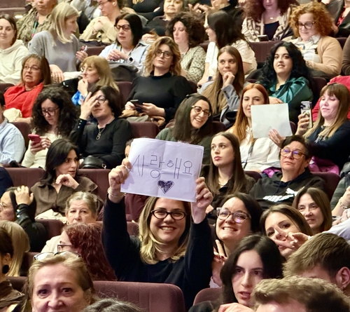 自ら書いたハングルのプラカードを持って、21日(現地時間)イタリア·フィレンツェのラ·コンパニア劇場で行われた俳優コン·ユのマスタークラスイベントに参加したアニタ·トメスク。 当日のイベントは、予約開始から3分で全席が完売した。