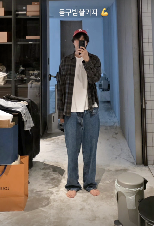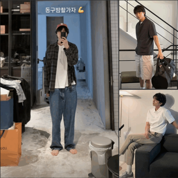 写真の中のコンユは白いTシャツの上にチェックのシャツを羽織って、ゆったりとしたフィットのジーンズをマッチしてクアンクルックを披露しました。